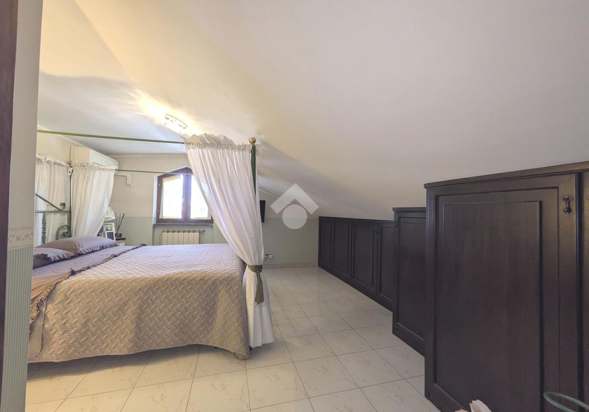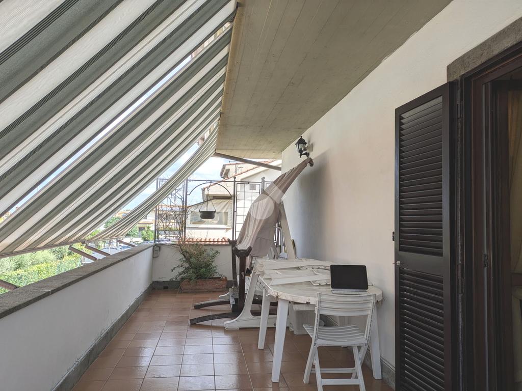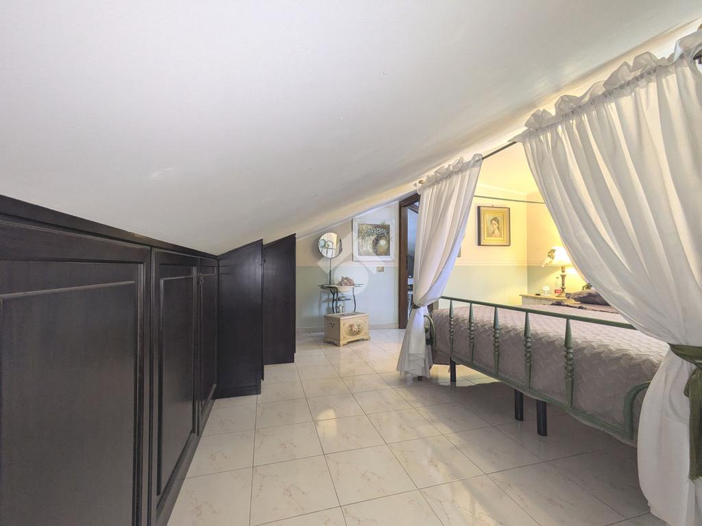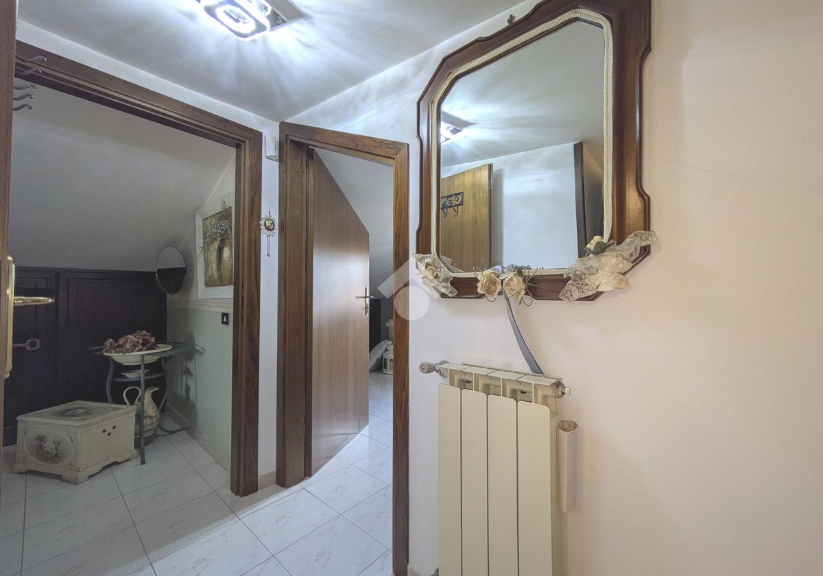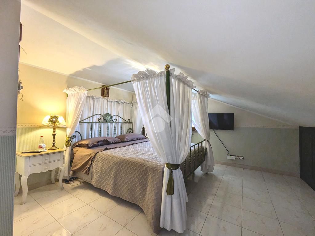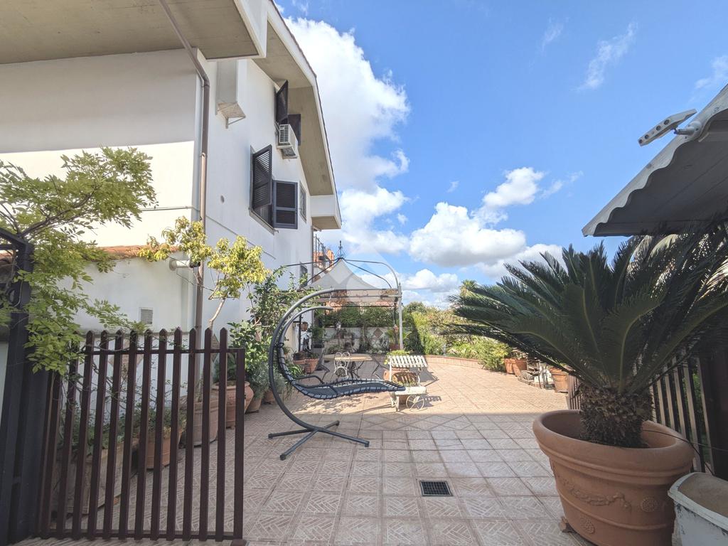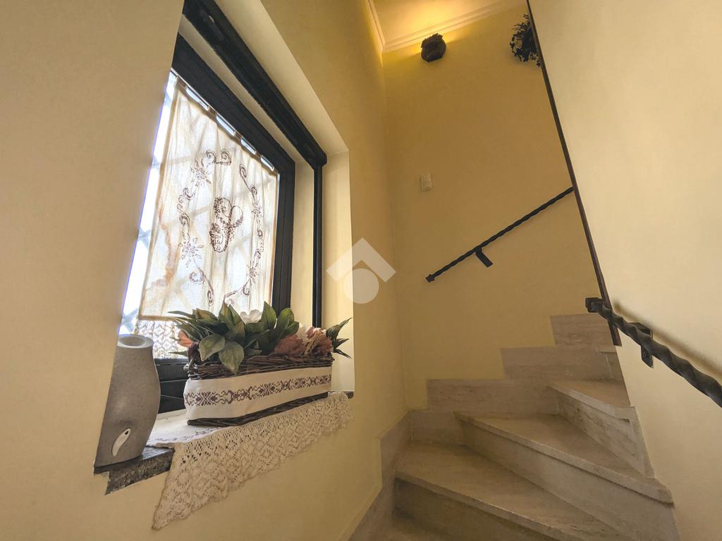 L'accesso alla proprietà avviene attraverso un parcheggio privato interno, comodo anche per due vetture grandi, da cui dopo aver parcheggiato possiamo entrare all'interno nel giardino. Il giardino che ci accoglie è principalmente mattonato ma con delle aiuole verdi molto curate. Questo spazio è la vera perla della casa, uno spazio all'aperto dove trascorrere le belle giornate in compagnia degli amici e della famiglia, tra barbecue e tavolate. Per le giornate più fredde è stato creato un portico a vetri dove intrattenersi con un salottino di rappresentanza o eventualmente dove creare uno studio. E per gli amanti del bricolage è presente una casetta in legno dove poter riporre tutti gli attrezzi o dare libero sfogo alla creatività. Attraverso una scala in marmo saliamo al piano primo. Ad accoglierci è un salone molto luminoso grazie alla doppia esposizione. Il parquet, caldo ed elegante, fa da cornice a questo ambiente curato in ogni minimo dettaglio. Grazie alle due porte finestre, possiamo uscire sul terrazzo, perimetrale ed abitabile, dove poter mangiare all'aperto nella bella stagione. La cucina è un ambiente separato dove poter mangiare anche in 6 persone, arredato da una bellissima cucina in muratura dallo stile rustico, correlata di camino. La zona notte, che si trova al piano superiore dell'immobile, comprende una camera da letto con letto a baldacchino ed una cameretta. I due piani sono separati da una porta al fine di permettere il risparmio energetico e un miglior riscaldamento/raffrescamento dei singoli ambienti. I servizi, che si trovano sia al piano primo che al piano superiore, offrono praticità e comfort per la vita quotidiana e sono arredati di lavabi su misura: uno ha la vasca e l'altro ha la doccia. Il fabbricato di cui fa parte è stato costruito nel 1987, ma l'appartamento internamente è stato ristrutturato totalmente dall'attuale proprietario, che non ha risparmiato ne sulla qualità dei materiali ne sui dettagli. E' dotato di aria condizionata, persiane blindate, zanzariere, antifurto e tende da sole. La casa viene venduta con l'arredamento incluso di: cucina, bagni, armadi su misura, letto a baldacchino e casetta di legno in giardino.