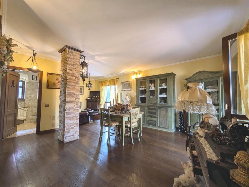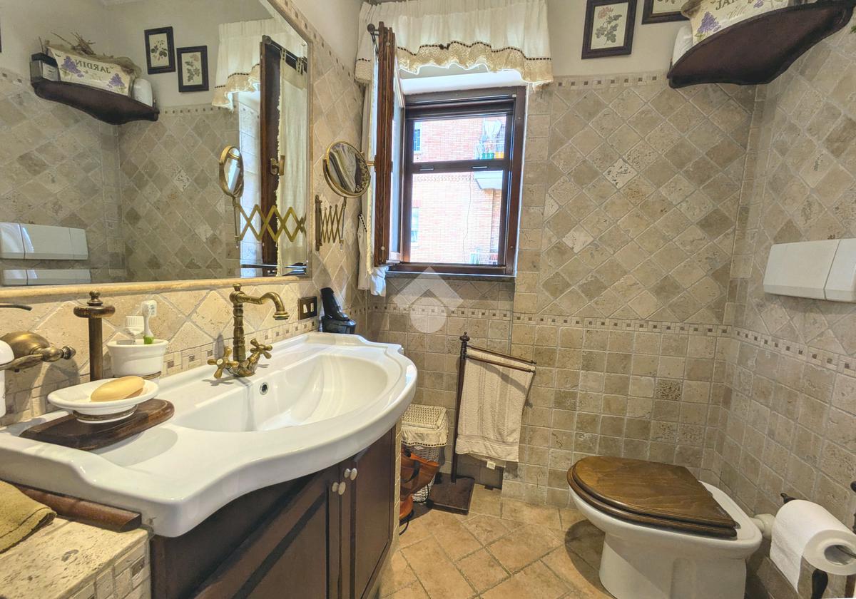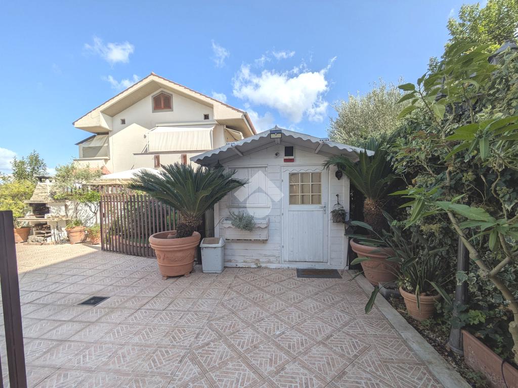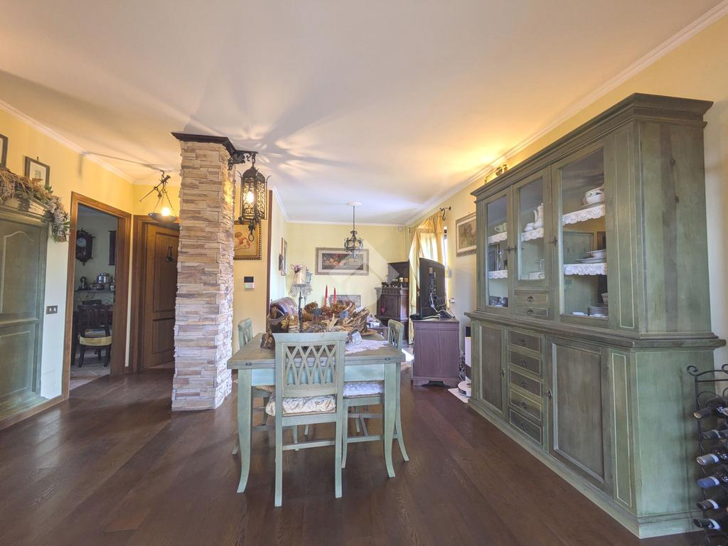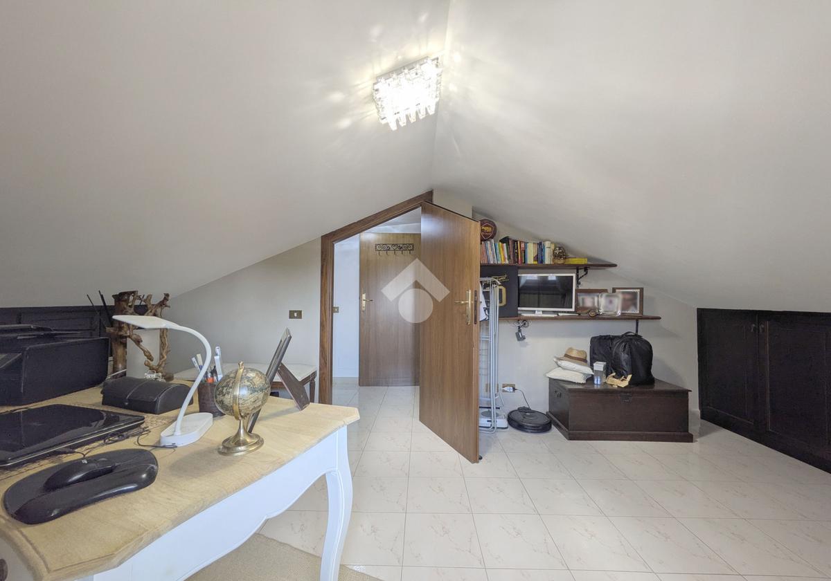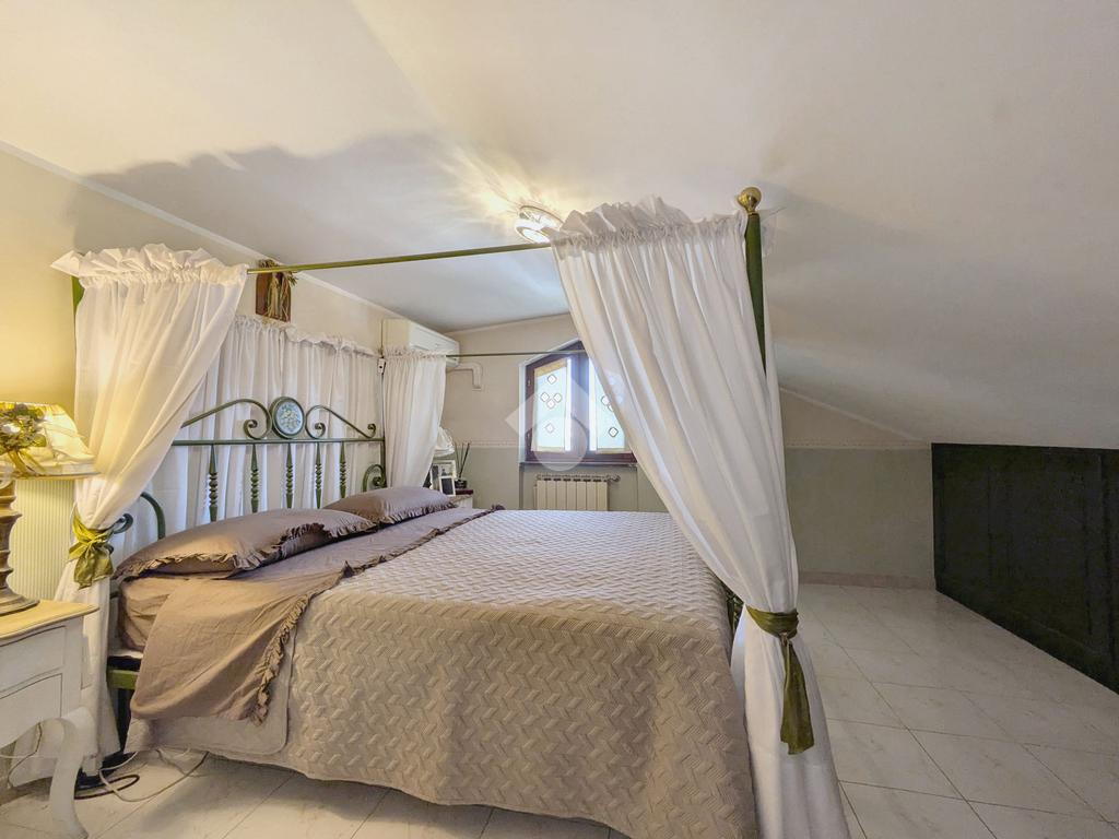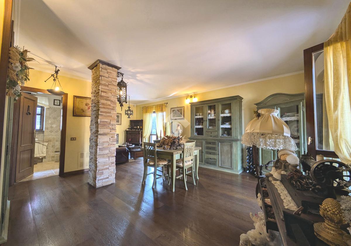 L'accesso alla proprietà avviene attraverso un parcheggio privato interno, comodo anche per due vetture grandi, da cui dopo aver parcheggiato possiamo entrare all'interno nel giardino. Il giardino che ci accoglie è principalmente mattonato ma con delle aiuole verdi molto curate. Questo spazio è la vera perla della casa, uno spazio all'aperto dove trascorrere le belle giornate in compagnia degli amici e della famiglia, tra barbecue e tavolate. Per le giornate più fredde è stato creato un portico a vetri dove intrattenersi con un salottino di rappresentanza o eventualmente dove creare uno studio. E per gli amanti del bricolage è presente una casetta in legno dove poter riporre tutti gli attrezzi o dare libero sfogo alla creatività. Attraverso una scala in marmo saliamo al piano primo. Ad accoglierci è un salone molto luminoso grazie alla doppia esposizione. Il parquet, caldo ed elegante, fa da cornice a questo ambiente curato in ogni minimo dettaglio. Grazie alle due porte finestre, possiamo uscire sul terrazzo, perimetrale ed abitabile, dove poter mangiare all'aperto nella bella stagione. La cucina è un ambiente separato dove poter mangiare anche in 6 persone, arredato da una bellissima cucina in muratura dallo stile rustico, correlata di camino. La zona notte, che si trova al piano superiore dell'immobile, comprende una camera da letto con letto a baldacchino ed una cameretta. I due piani sono separati da una porta al fine di permettere il risparmio energetico e un miglior riscaldamento/raffrescamento dei singoli ambienti. I servizi, che si trovano sia al piano primo che al piano superiore, offrono praticità e comfort per la vita quotidiana e sono arredati di lavabi su misura: uno ha la vasca e l'altro ha la doccia. Il fabbricato di cui fa parte è stato costruito nel 1987, ma l'appartamento internamente è stato ristrutturato totalmente dall'attuale proprietario, che non ha risparmiato ne sulla qualità dei materiali ne sui dettagli. E' dotato di aria condizionata, persiane blindate, zanzariere, antifurto e tende da sole. La casa viene venduta con l'arredamento incluso di: cucina, bagni, armadi su misura, letto a baldacchino e casetta di legno in giardino.