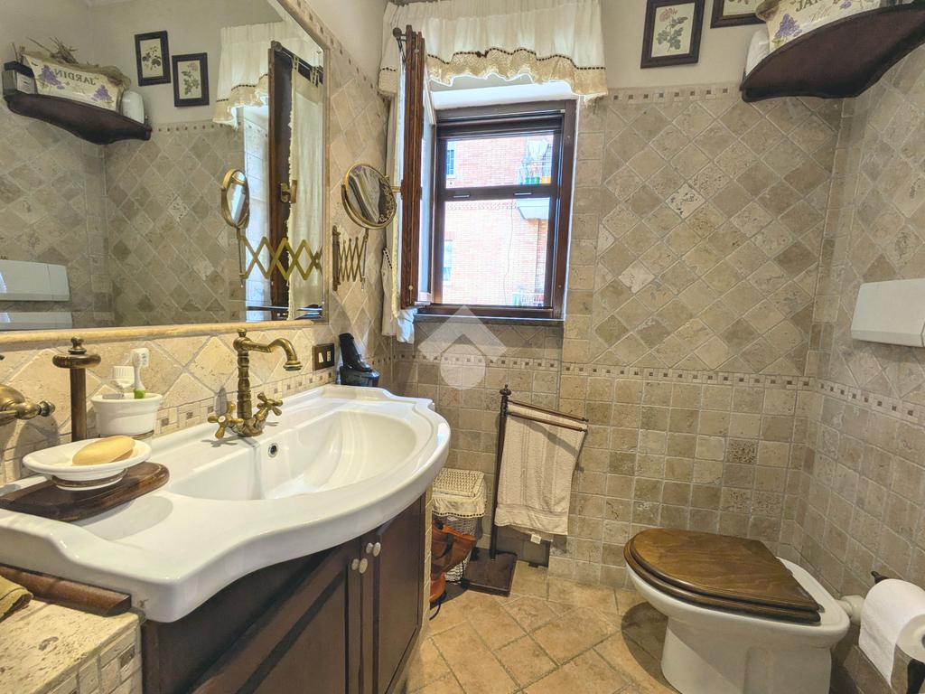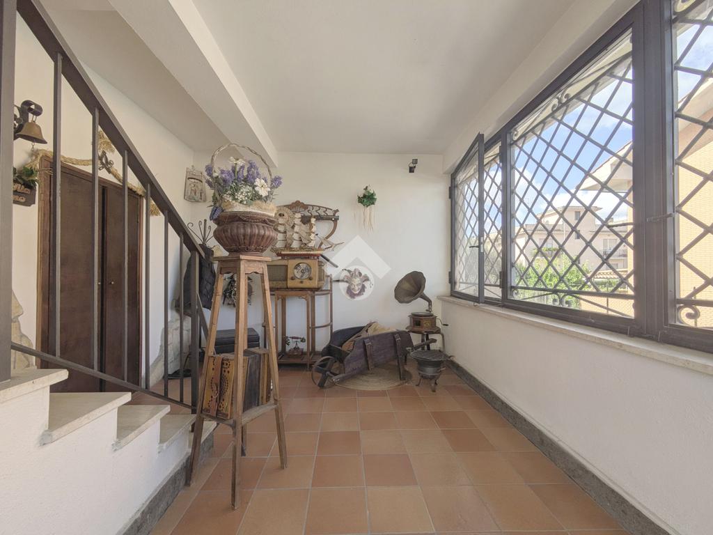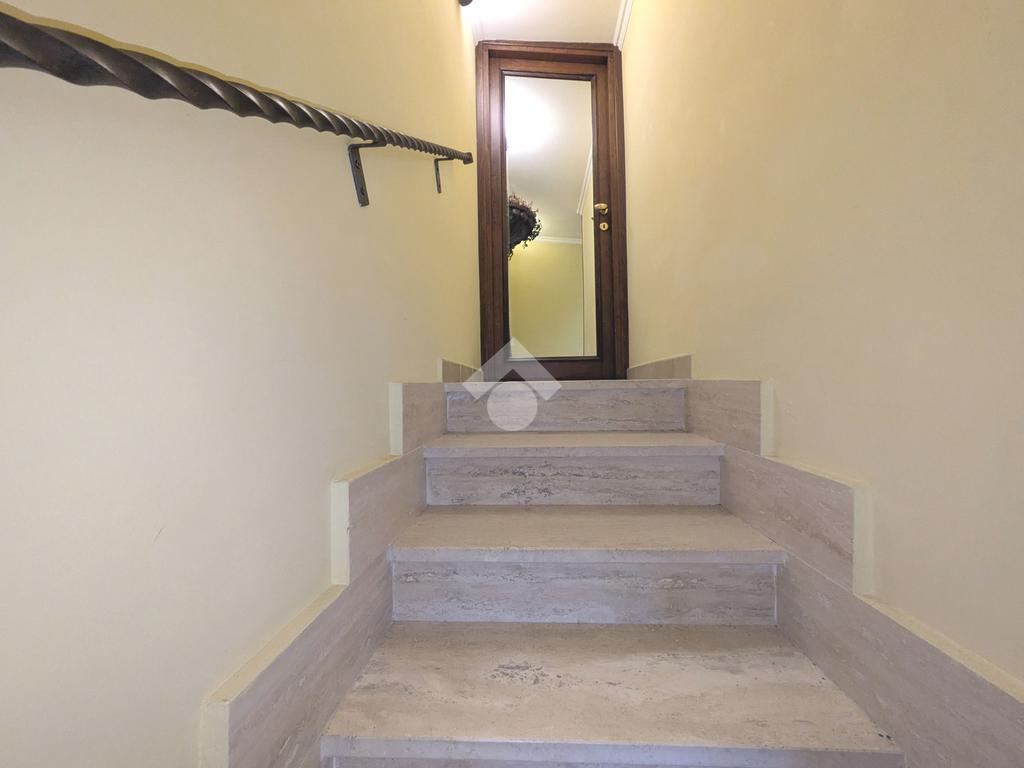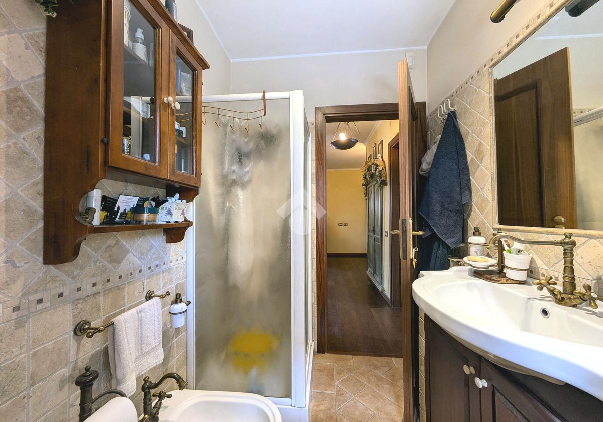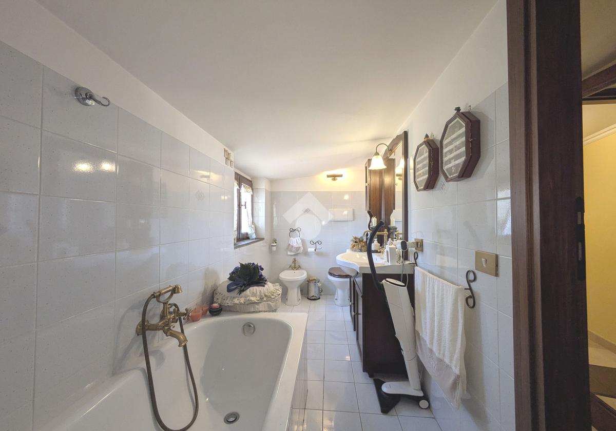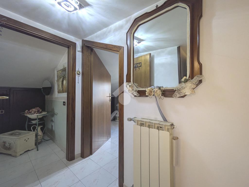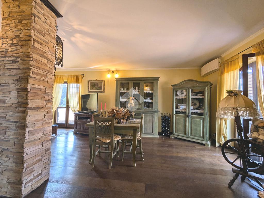 L'accesso alla proprietà avviene attraverso un parcheggio privato interno, comodo anche per due vetture grandi, da cui dopo aver parcheggiato possiamo entrare all'interno nel giardino. Il giardino che ci accoglie è principalmente mattonato ma con delle aiuole verdi molto curate. Questo spazio è la vera perla della casa, uno spazio all'aperto dove trascorrere le belle giornate in compagnia degli amici e della famiglia, tra barbecue e tavolate. Per le giornate più fredde è stato creato un portico a vetri dove intrattenersi con un salottino di rappresentanza o eventualmente dove creare uno studio. E per gli amanti del bricolage è presente una casetta in legno dove poter riporre tutti gli attrezzi o dare libero sfogo alla creatività. Attraverso una scala in marmo saliamo al piano primo. Ad accoglierci è un salone molto luminoso grazie alla doppia esposizione. Il parquet, caldo ed elegante, fa da cornice a questo ambiente curato in ogni minimo dettaglio. Grazie alle due porte finestre, possiamo uscire sul terrazzo, perimetrale ed abitabile, dove poter mangiare all'aperto nella bella stagione. La cucina è un ambiente separato dove poter mangiare anche in 6 persone, arredato da una bellissima cucina in muratura dallo stile rustico, correlata di camino. La zona notte, che si trova al piano superiore dell'immobile, comprende una camera da letto con letto a baldacchino ed una cameretta. I due piani sono separati da una porta al fine di permettere il risparmio energetico e un miglior riscaldamento/raffrescamento dei singoli ambienti. I servizi, che si trovano sia al piano primo che al piano superiore, offrono praticità e comfort per la vita quotidiana e sono arredati di lavabi su misura: uno ha la vasca e l'altro ha la doccia. Il fabbricato di cui fa parte è stato costruito nel 1987, ma l'appartamento internamente è stato ristrutturato totalmente dall'attuale proprietario, che non ha risparmiato ne sulla qualità dei materiali ne sui dettagli. E' dotato di aria condizionata, persiane blindate, zanzariere, antifurto e tende da sole. La casa viene venduta con l'arredamento incluso di: cucina, bagni, armadi su misura, letto a baldacchino e casetta di legno in giardino.