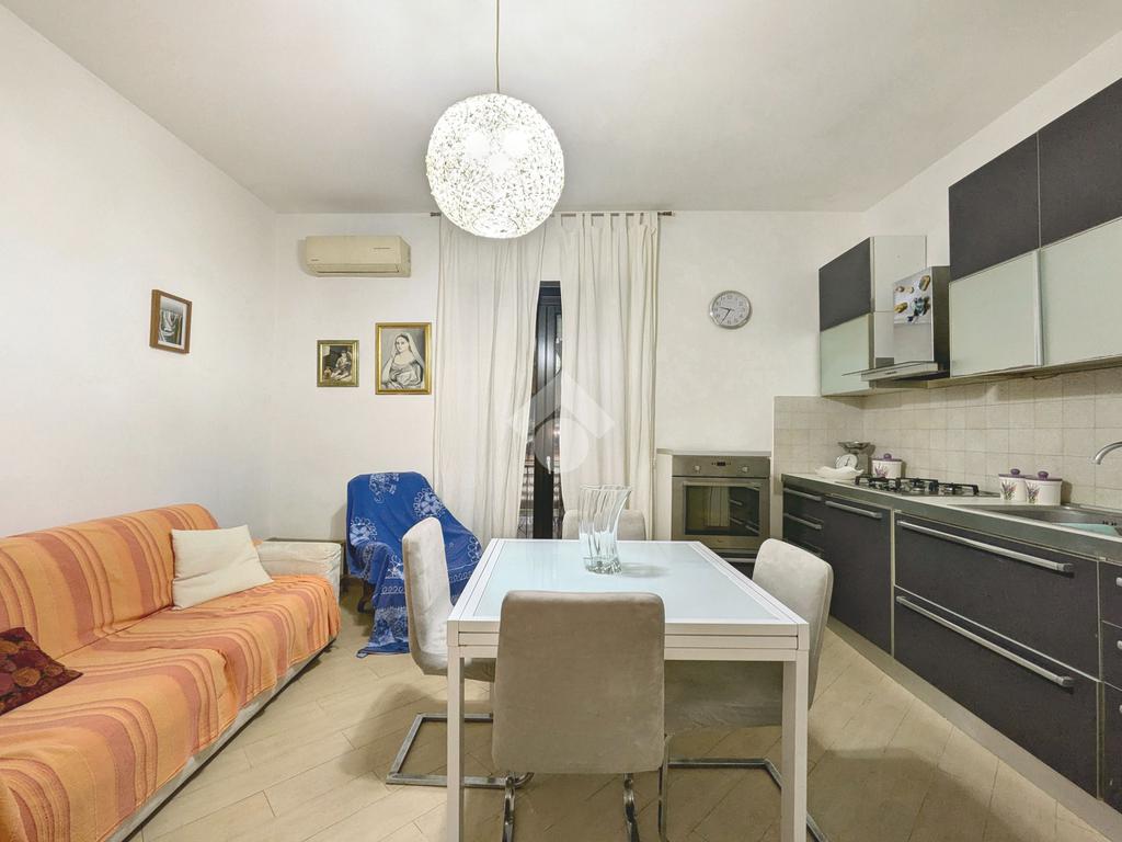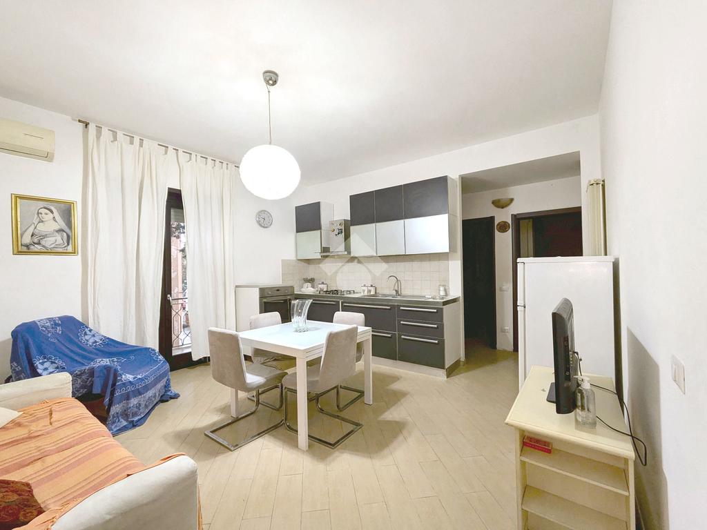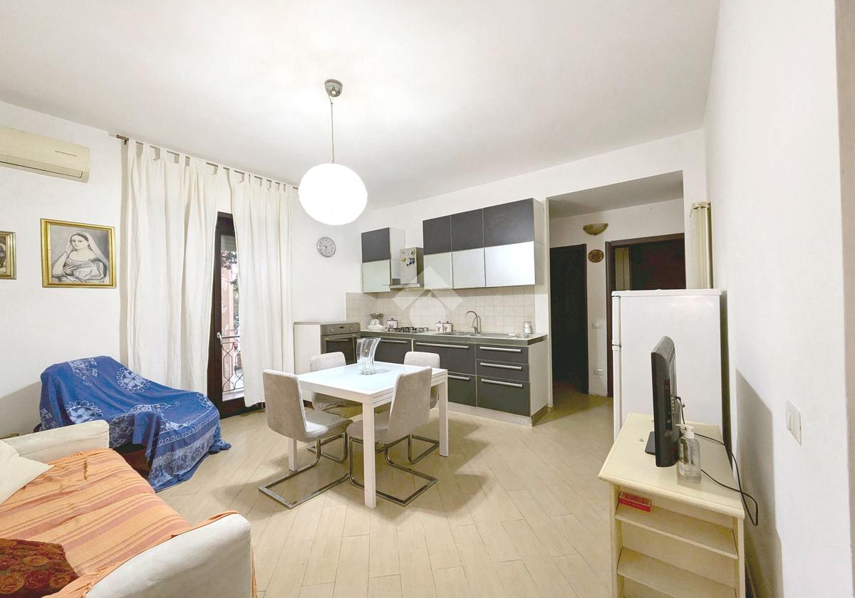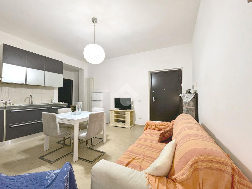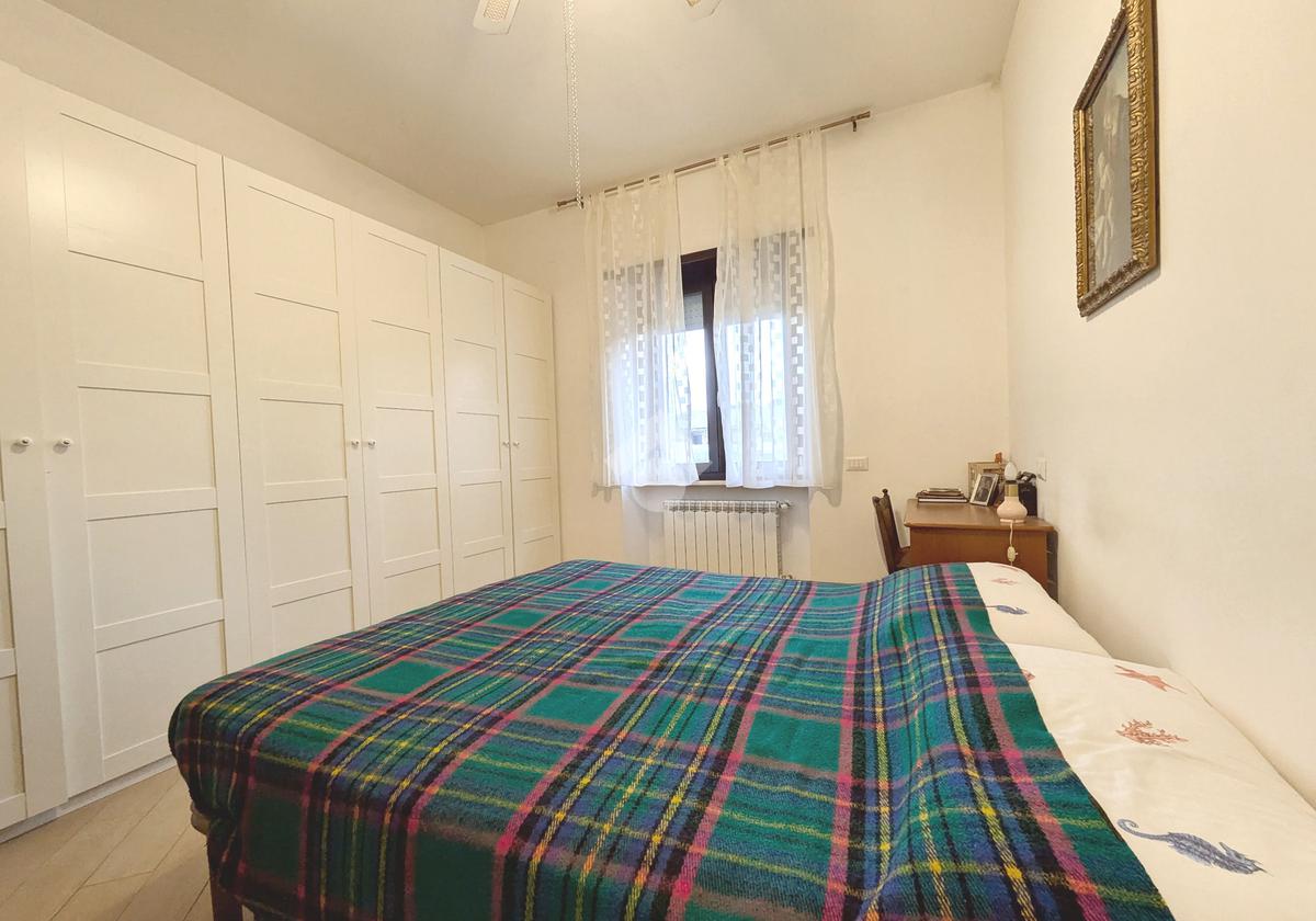 L'appartamento si compone di un luminoso soggiorno con angolo cottura con uscita su un balcone. La zona notte include una camera matrimoniale e una cameretta, quest'ultima dotata di un pratico balconcino. Il bagno è finestrato con box doccia.