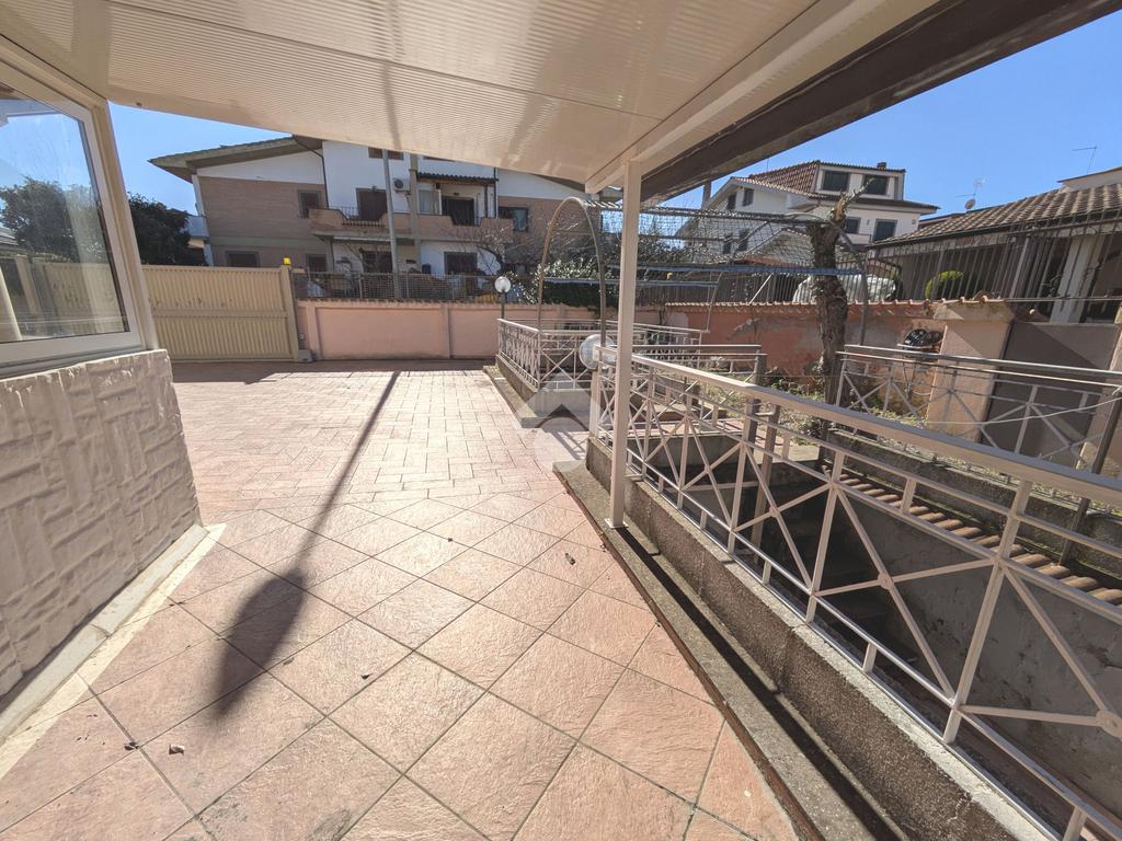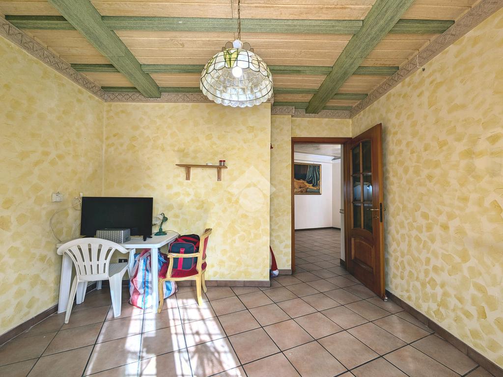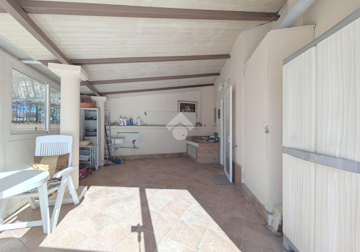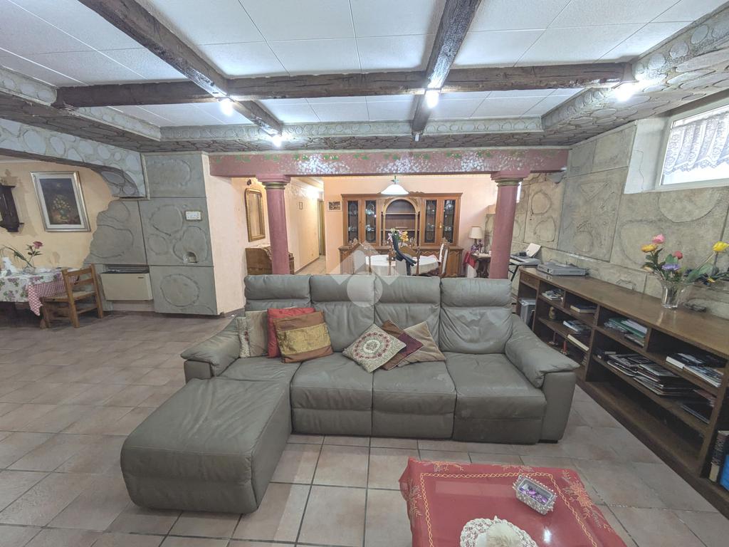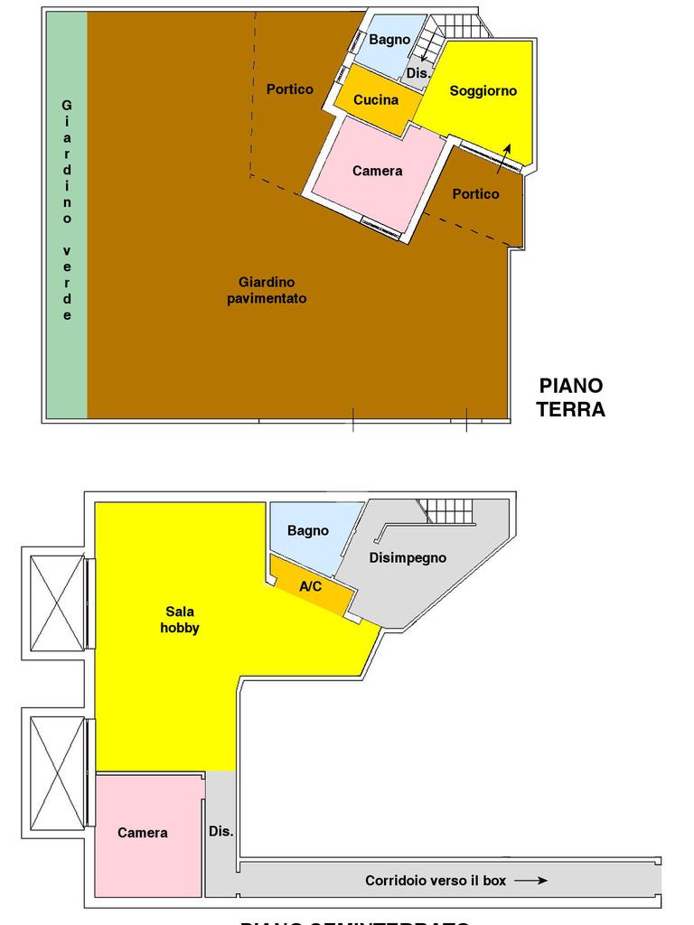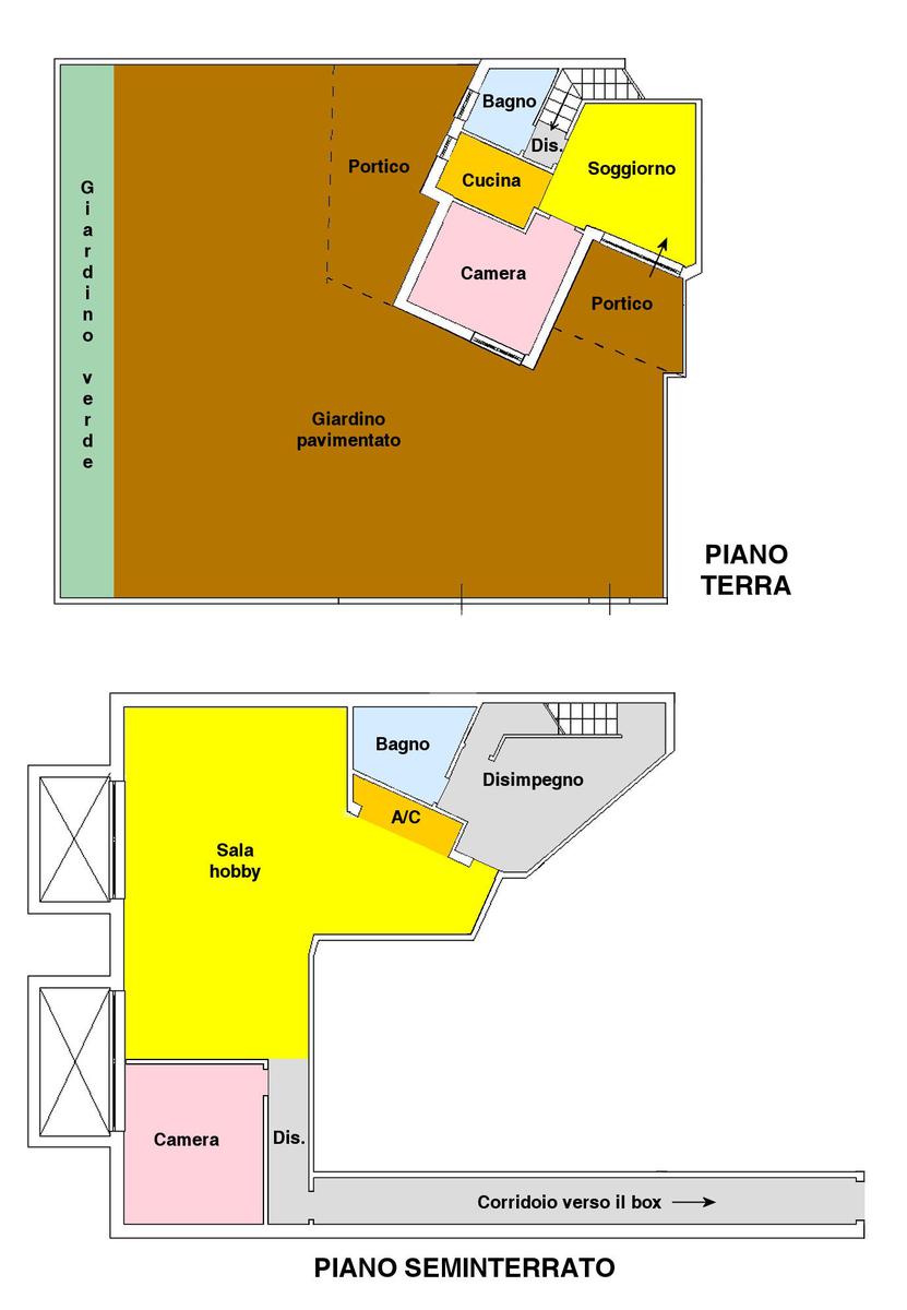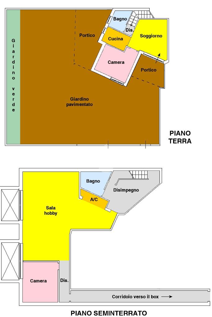 Si accede attraverso un cancello automatico che consente l'entrata sia pedonale che carrabile per più veicoli all'interno del giardino di proprietà. Questa area, prettamente pavimentata, è un ampio giardino di 180 mq, molto soleggiato perché gode di un ottima esposizione (sud- est); da qui si entra all'interno dell'appartamento dove ci accoglie un primo salottino, una camera da letto, un bagno ed un cucinotto. Attraverso una scala in muratura, si accede al piano seminterrato di 80 mq, la sala hobby: qui un comodo disimpegno ci introduce ad un grande soggiorno con angolo cottura, una camera da letto matrimoniale e un secondo bagno.