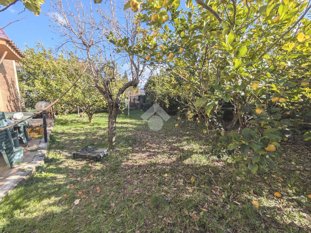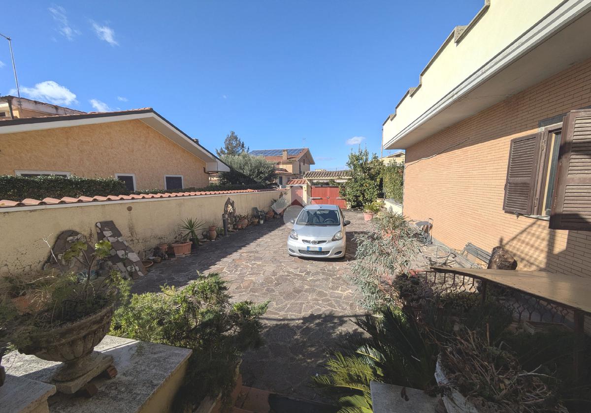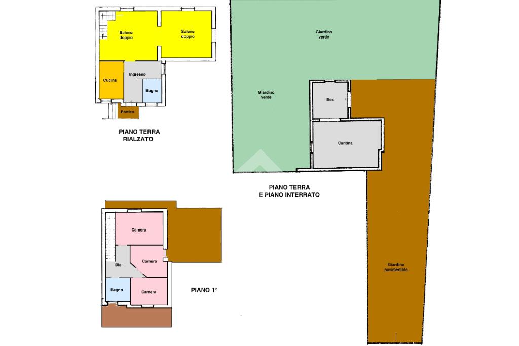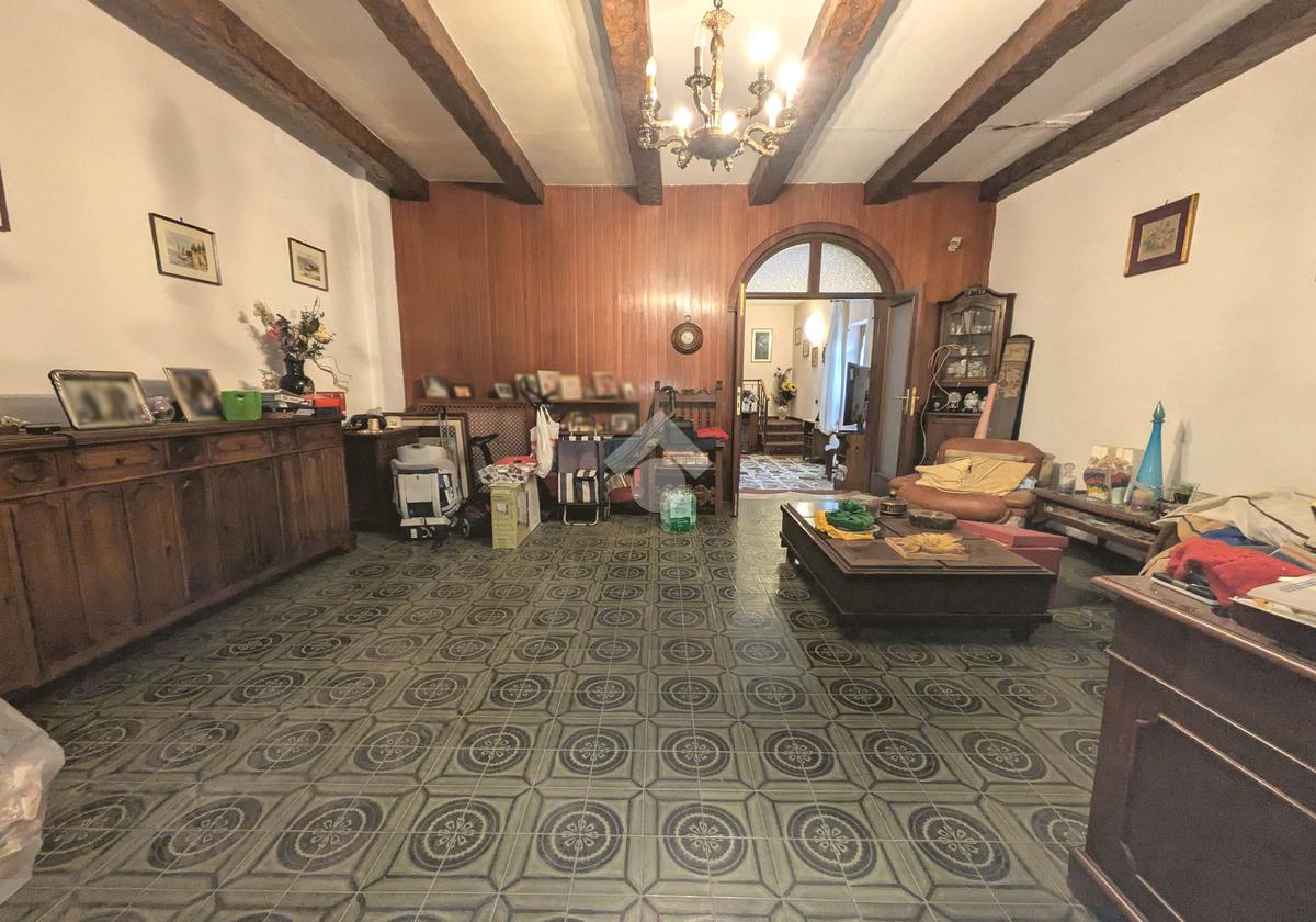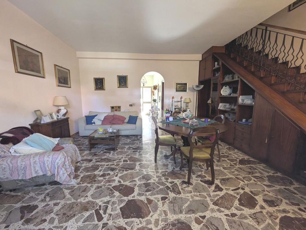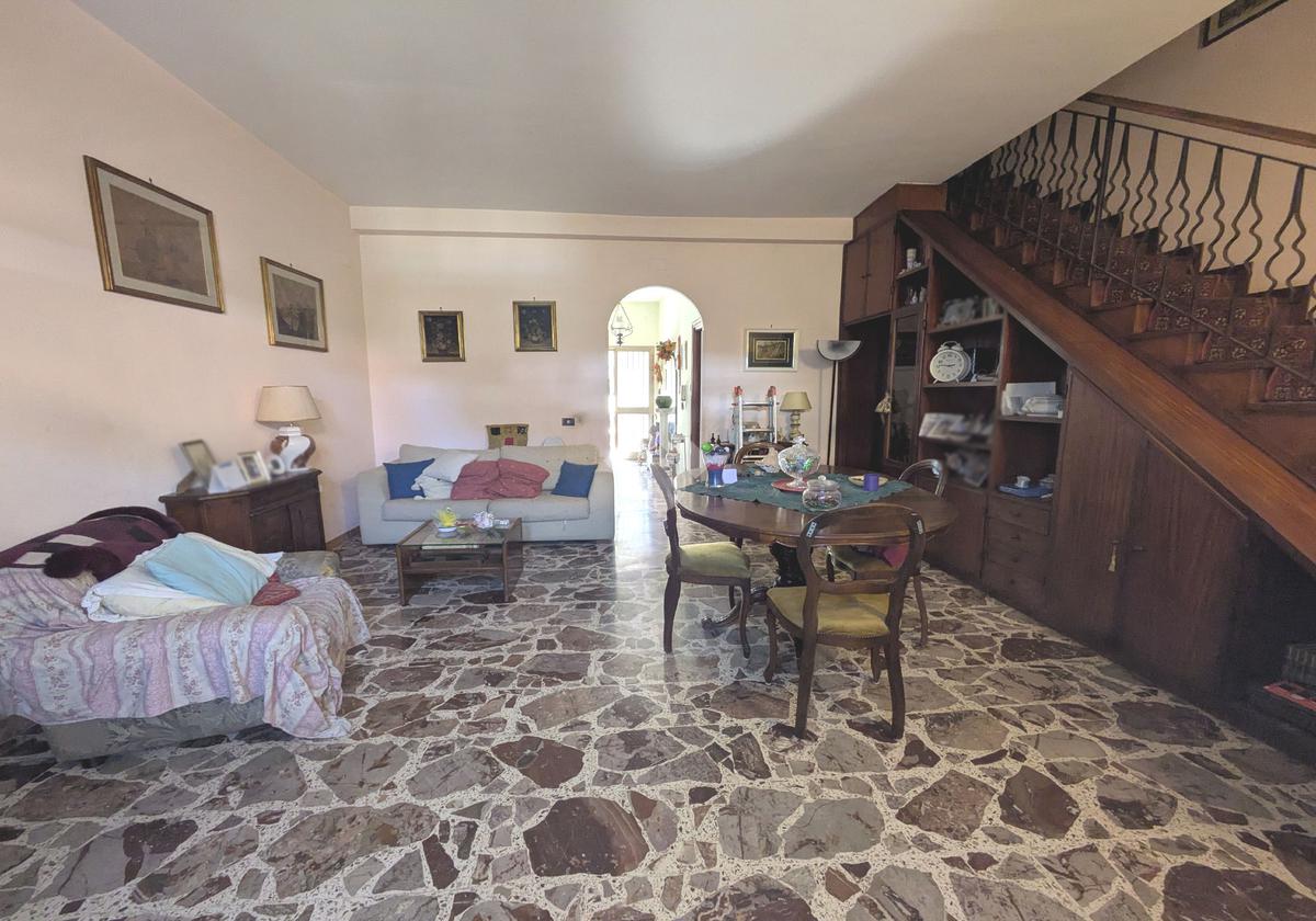 Entrando in casa ci colpisce la divisione degli ambienti,tipicamente degli anni 70: al piano terra abbiamo un ampio ingresso di rappresentanza, la cucina abitabile, un bagno, una ampia sala da pranzo, un secondo salone con camino e soffitto con le travi in legno. Tutti gli ambienti affacciano e/o escono sul giardino.